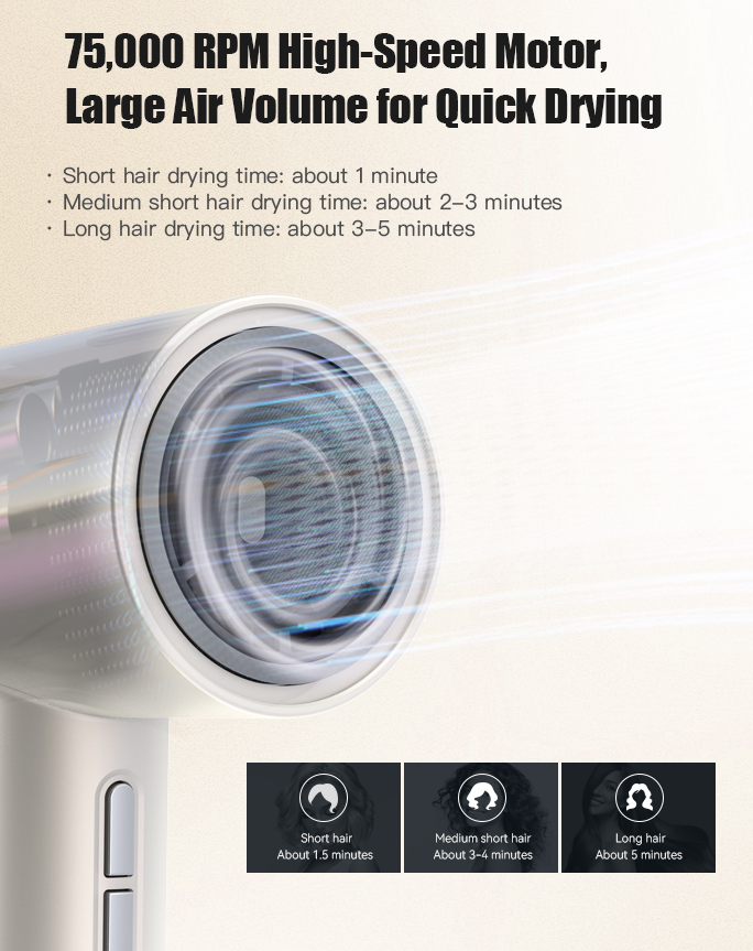 ✅ 75,000 RPM High-speed Motor for Fast Drying: Equipped with a 75,000 RPM high-speed motor, it generates strong, concentrated airflow to cut down drying time significantly—perfect for quickly styling thick or long hair without excessive heat damage.